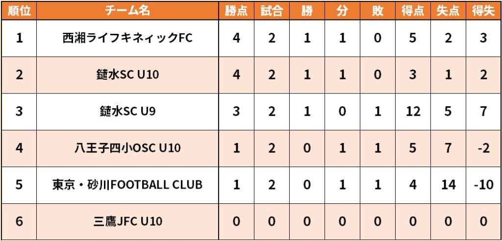 | 三鷹JFC U8 | 3 | 3 | 6 |