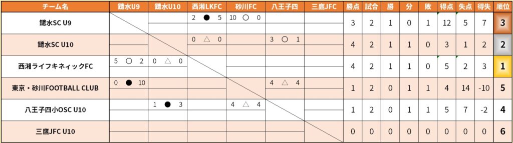 これで、U10リーグは、三鷹JFC U10を除く5チームが2ゲームずつを戦い、西湘と鑓水U10が勝ち点4を獲得。