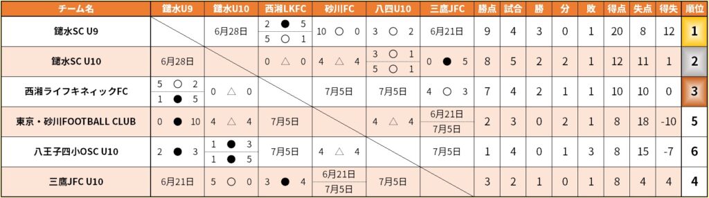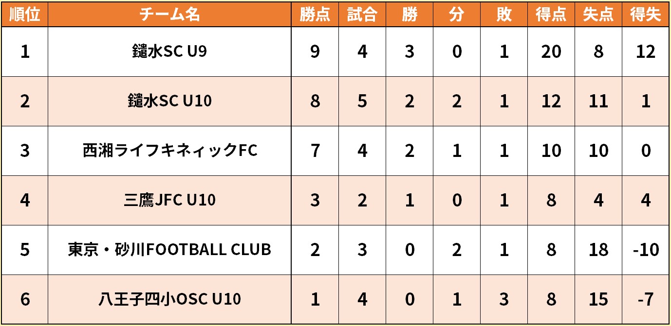 | 東京・砂川FOOTBALL CLUB | 3 | 1 | 4 |