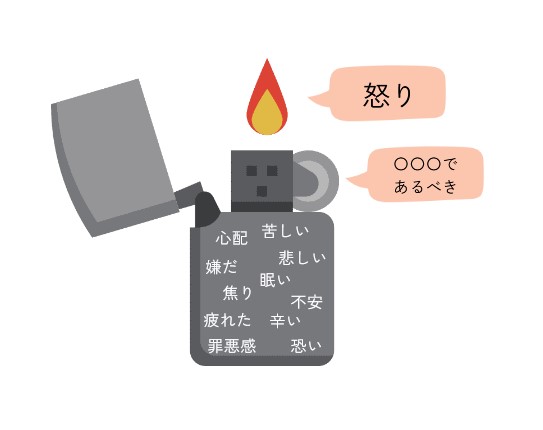 それに「~であるはず」「~であるべき」という自分の期待や願望、価値観が着火のトリガーとなって、怒りという炎が生まれるというわけです。
