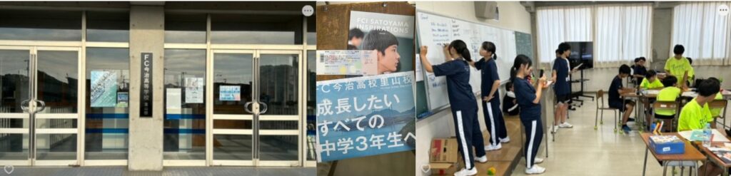(左)FC今治高校の正門、(中)同校のパンフレット、(右)オープンキャンパスで見学に来た中学生へ授業をする高校生たち