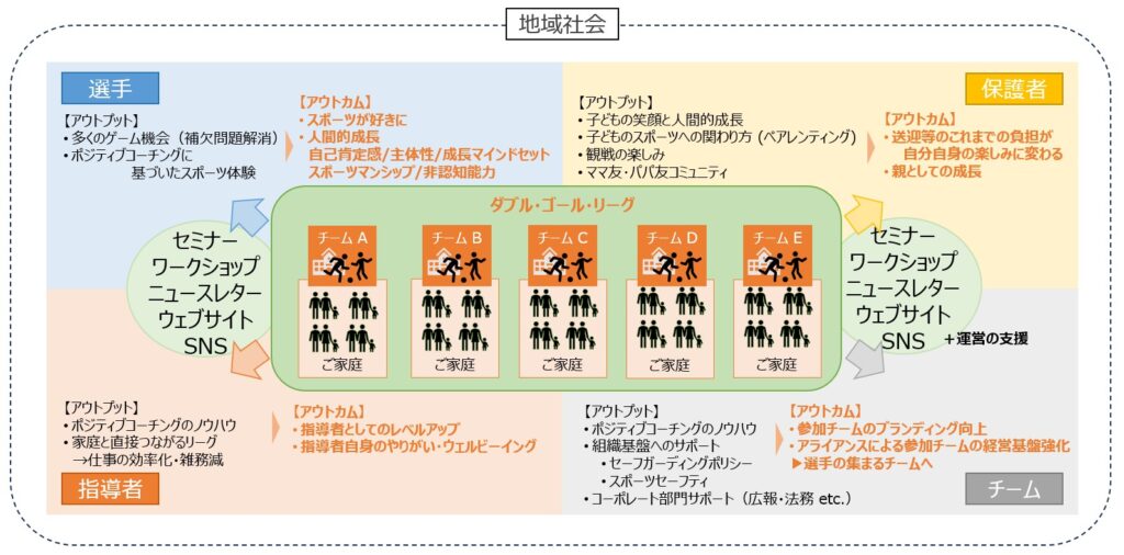 プラットフォームとして機能し、子どもたちを中心に置き、周りの保護者・指導者たちがつながっていくコミュニティとしての「ダブル・ゴール・リーグ®」を目指します。