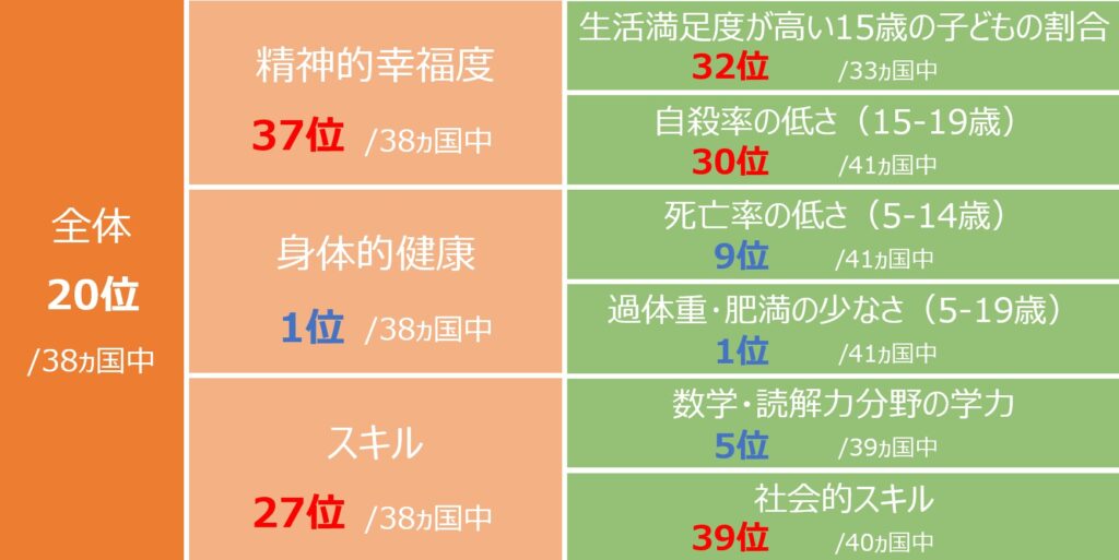 ユニセフによる2020年の調査。「精神的幸福度」「身体的健康」「スキル」の3分野から総合スコアを算出。各項目の日本の順位は以下の通り(38ヵ国中)であり、これらの総合点が20位となる。